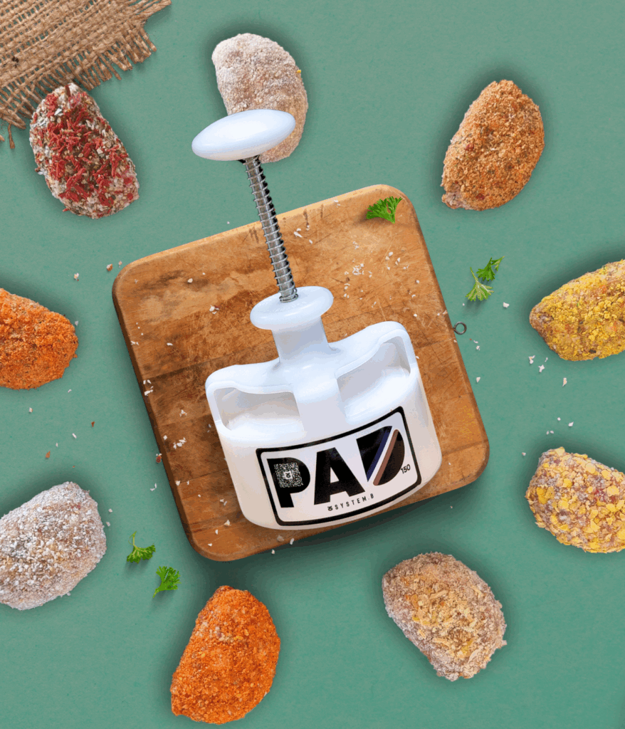 With the PAD, you can shape your preparations exactly the way you want. Easily create cordon bleu by first preparing a stuffed cutlet (cheese, ham, filling, etc.), closing it like a paupiette, and coating it with breadcrumbs. A simple press inside the PAD gives it a uniform, professional shape.